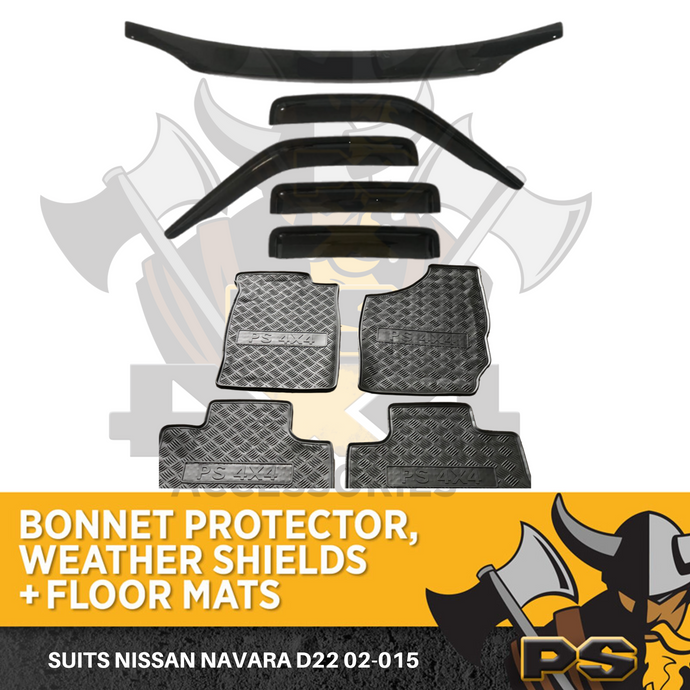 Bonnet Protector, Window Visors & Floor Mats To Suit Nissan Navara D22 2002-2015 Weathershields