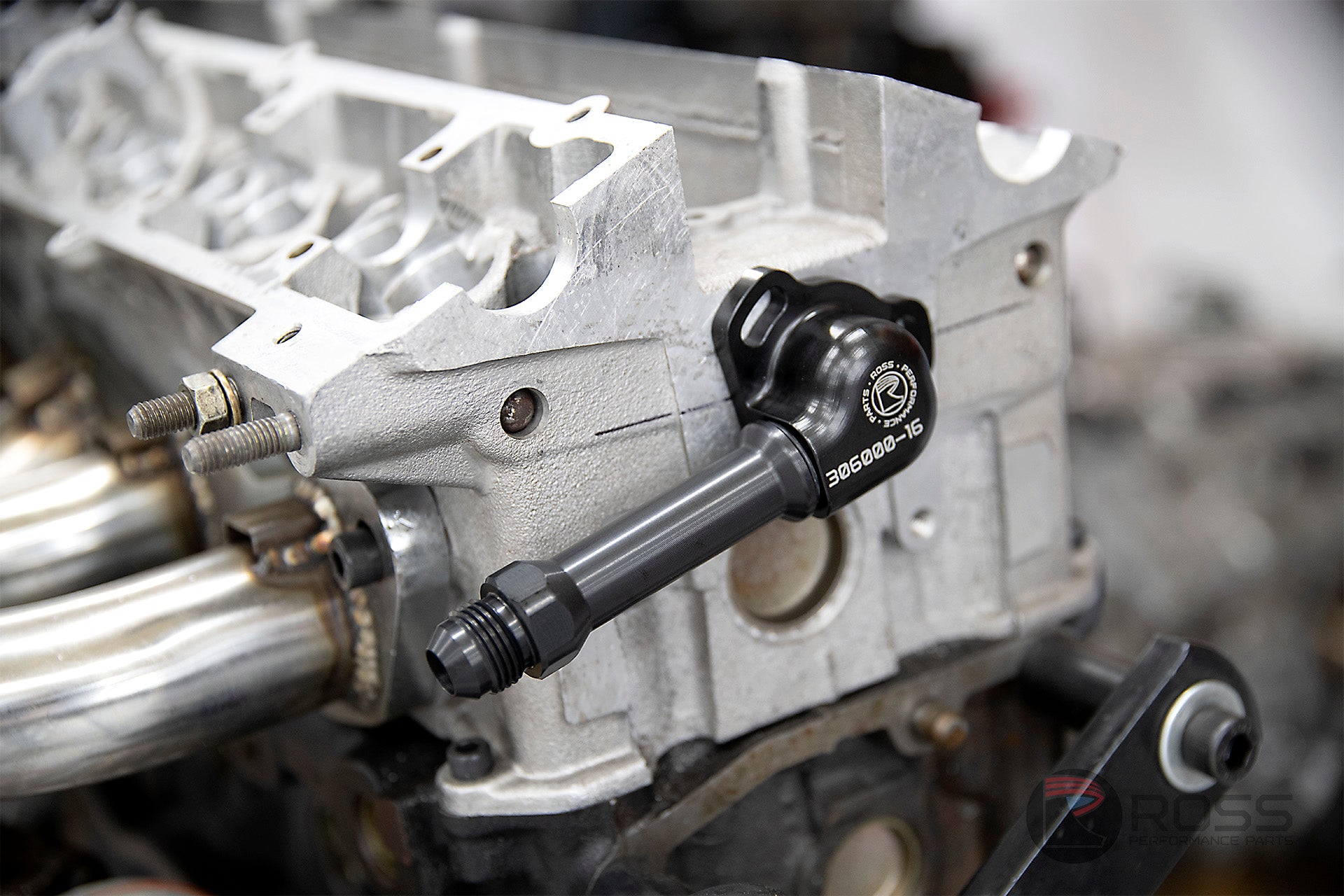 The Ross Performance Parts Nissan RB Twin Cam Head Drain Adaptor is designed to help prevent potentially dangerous amounts of oil from pooling in the back of the head.