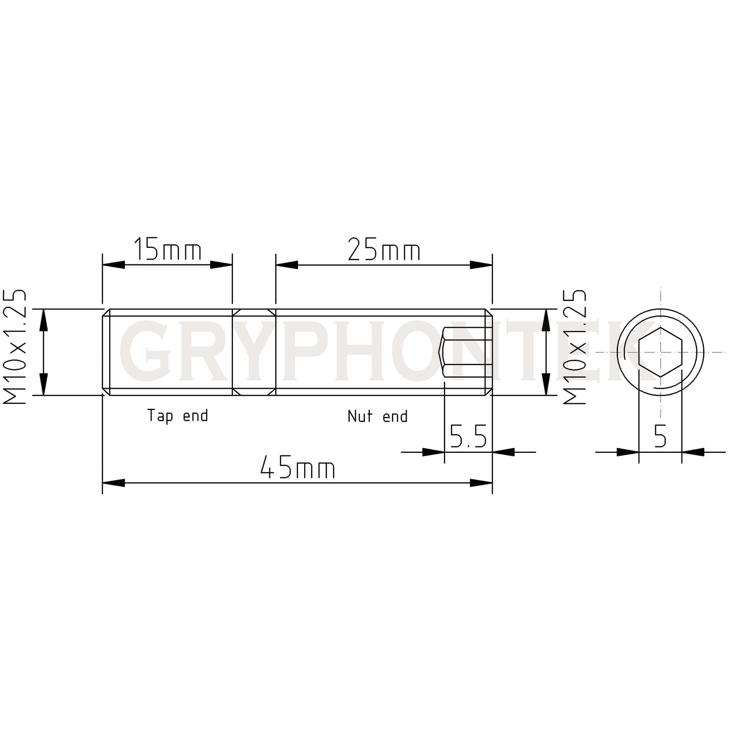 - M10 x 1.25 tap end to M10 x 1.25 nut end studs – 45mm long