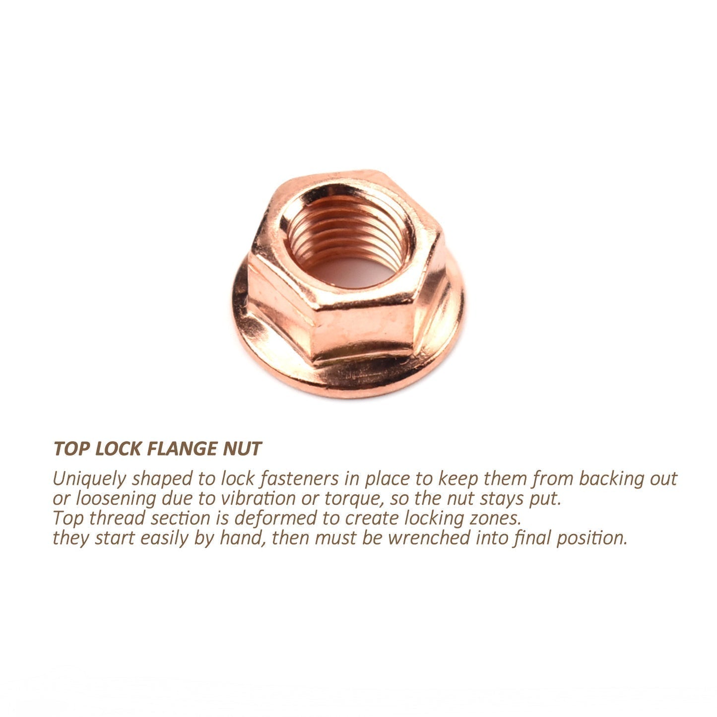 - Nut: Top lock flange nut copper plated steel